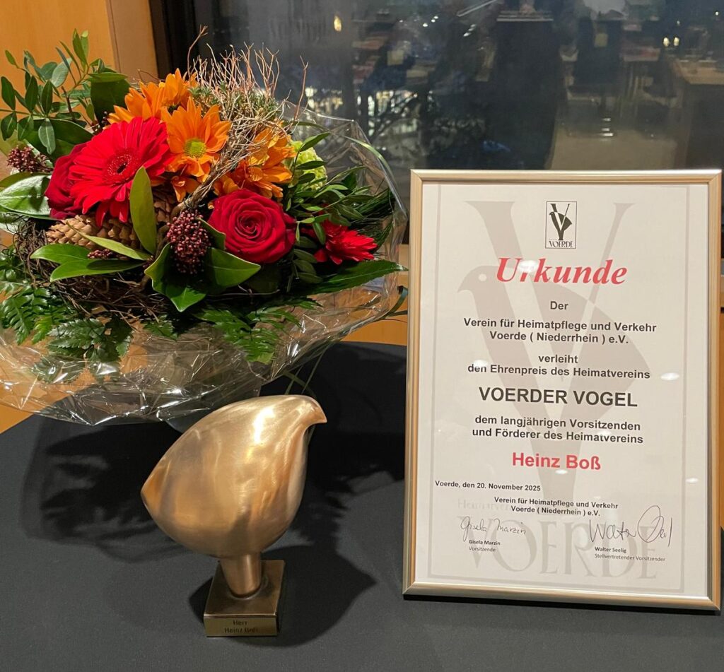 Am 20. November 2025 verlieh der Heimatverein Voerde an seinen langjährigen Vorsitzenden Heinz Boß für sein Lebenswerk die Auszeichnung „Voerder Vogel“. An der Veranstaltung nahmen seine Familie und Freunde, zahlreiche Weggefährten aus Sport und Politik sowie als Stellvertreter des Landrats des Kreises Wesel Günter Helbig teil.